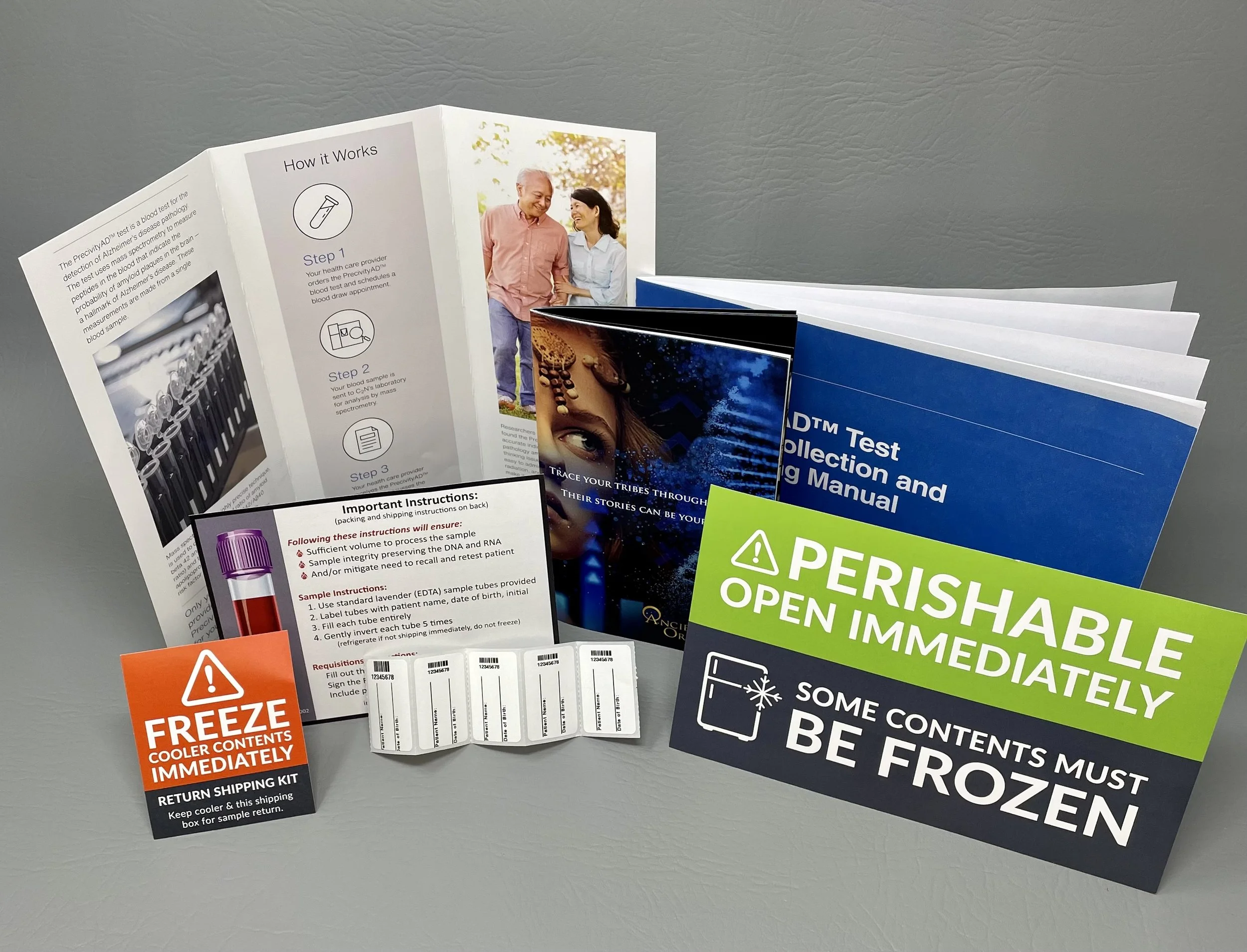 Custom specimen collection kit instructions and graphics.